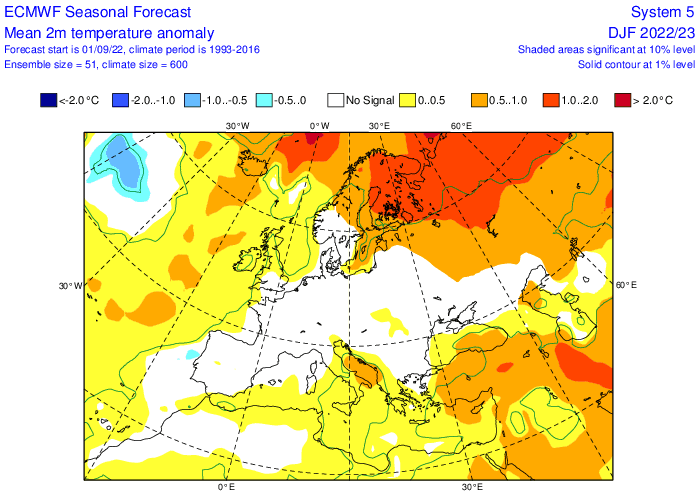Projections des anomalies thermiques pour l'hiver 2022-2023 - modèle européen via ECMWF