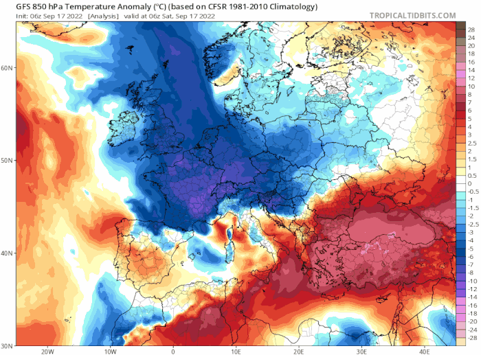 Anomalies thermiques de la masse d'air du 18 au 28 septembre 2022 - via tropicaltidbits.com