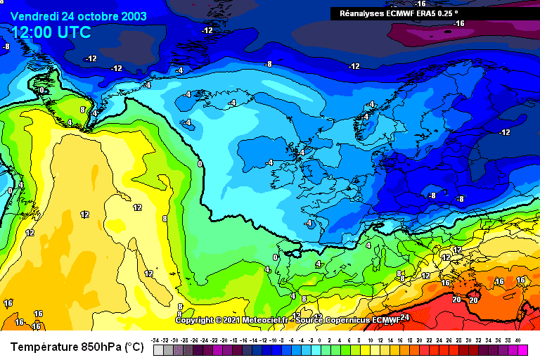 Masse d'air à 850 hPa (vers 1500m) le 24 octobre 2003 - réanalyse via meteociel.fr