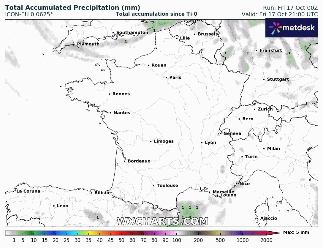 Ce temps perturbé et humide persistera ensuite tout au long de la semaine du 20 au 26 octobre avec une succession de fronts pluvieux sur le pays. Seules les régions méditerranéennes pourraient rester plus à l'écart après le passage frontal du lundi 20 octobre.