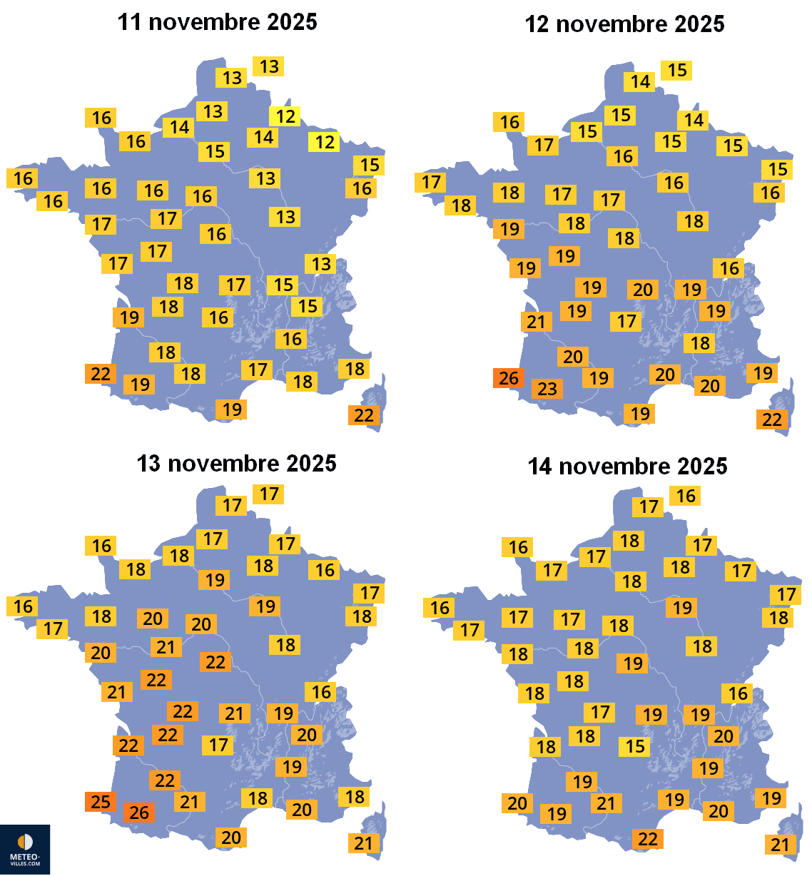 Températures maximales prévues sur la France entre le 11 et le 14 novembre 2025 – Météo-Villes